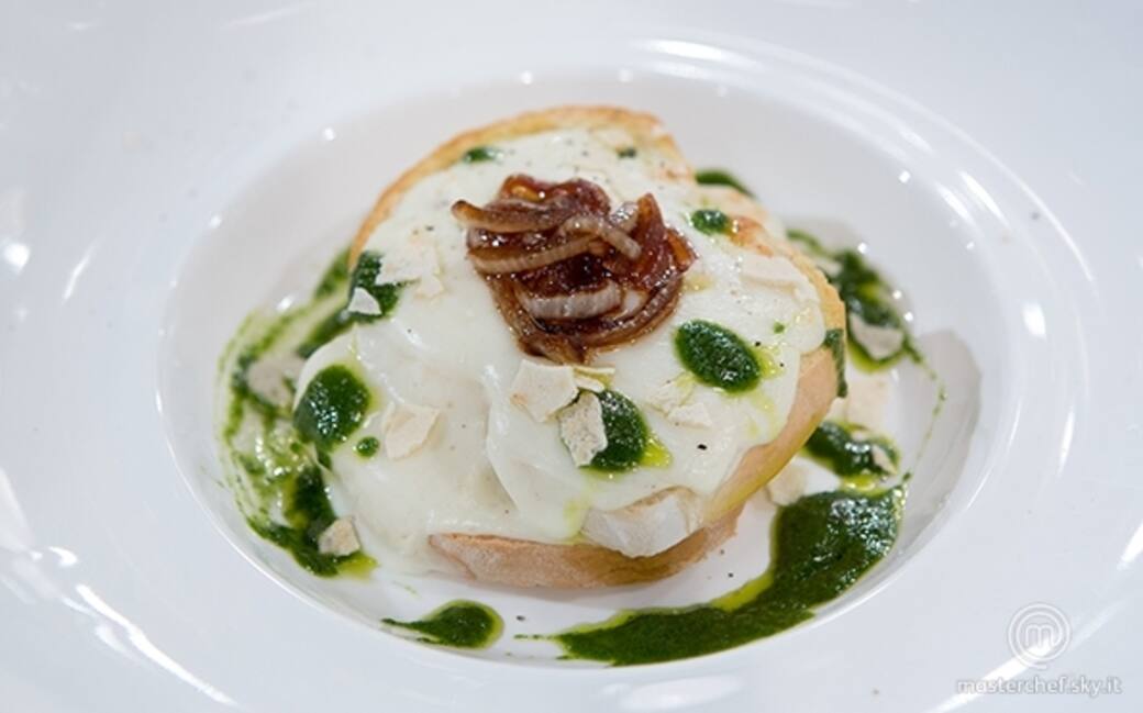 Cuocere le cipolle borettane in una casseruola con un filo d'olio e un goccio d'acqua. Quando le cipolle saranno cotte aggiungerle alla besciamella e frullare il tutto. Tostare leggermente le fette di pane in forno con un filo d'olio. Tagliare a fette sottili le cipolle dorate, farle appassire in padella con un filo d'olio e un goccio d'acqua per almeno 10 minuti, infine aggiungere qualche goccia di aceto balsamico in modo da glassarle.