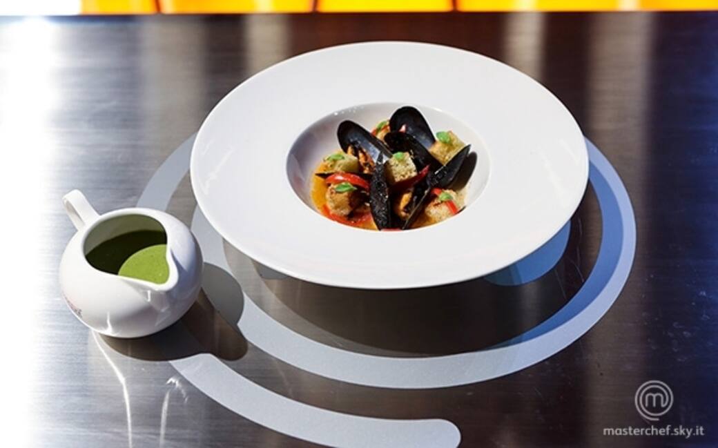 Sul fondo del piatto versare un mestolo di acqua di cozze bilanciata con la bisque di crostacei, aggiungere alcune cozze sgusciate e terminare con 5-6 cozze con il guscio. Adagiare i crostini di pane, qualche petalo di pomodorino, delle piccole foglie di basilico e una spolverata di pepe. Grattare pochissima scorza di limone in superficie. Servire con la salsa allo zenzero a parte.
