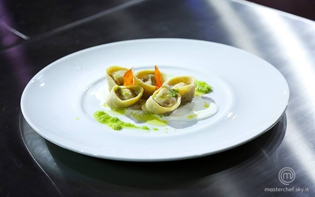 Stendere la pasta e ricavarne dei tondi. Servendosi del sac à poche aggiungere il ripieno, chiudere a mezzaluna e poi a raviolo. Lessare per pochi minuti, ripassare un minuto in poco olio evo e un cucchiaio di acqua. Impiattare su una base di burrata e irrorare con poco pesto di olive e le bucce di pomodoro disidratate.