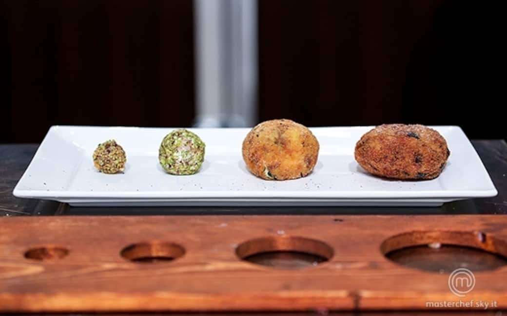 Per la polpetta più piccola: tritare il merluzzo, aggiungere un po' di patata, pepe e formare una pallina di 2 centimetri di diametro. Passare nell'uovo, poi nella granella di pistacchi e friggere in abbondante olio di semi.