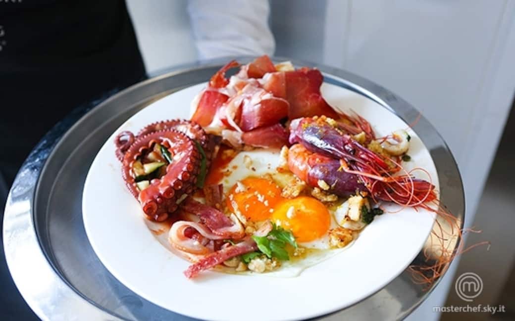 In una padella rovente cuocere per pochi secondi i gamberi con del succo di arancia, tagliare a striscioline le seppie e cuocerle nella stessa padella, frullare il prezzemolo e la menta con dell'olio e del sale. Impiattare i gamberi con le seppia sopra, l'olio aromatico, scorze di arancia e lime.