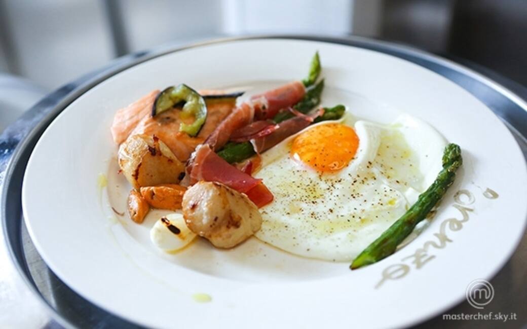 Finire la cottura dei cipollotti in forno. Avvolgere gli sparagi con le fette di jamón. Cuocere l'uovo al tegamino e finire con sale e pepe.
