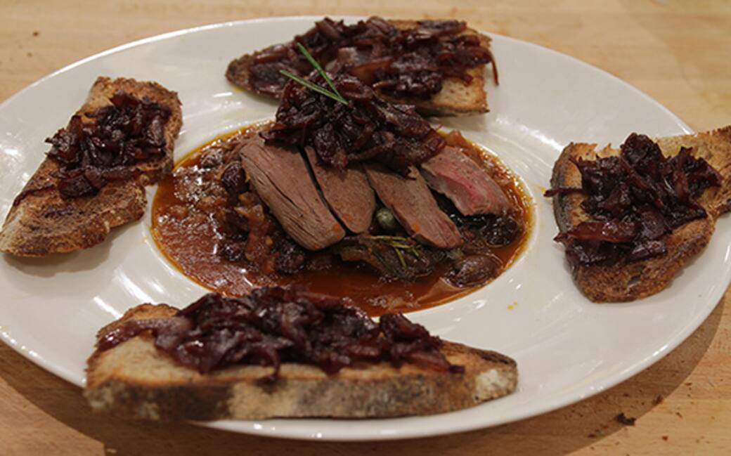 Create delle bruschette con del pane croccante, disponete le cipolle in agrodolce e sopra mettete un po’ del sugo di lepre e qualche fetta di sella di lepre. Decorare con l’alloro e il rosmarino e servite.