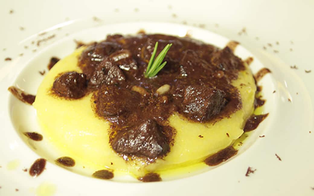 A parte fare della polenta e versatela nel piatto. Aggiungere infine la lepre ripassata nel “dolce forte” con un filo d'olio e decorare con un rametto di rosmarino.