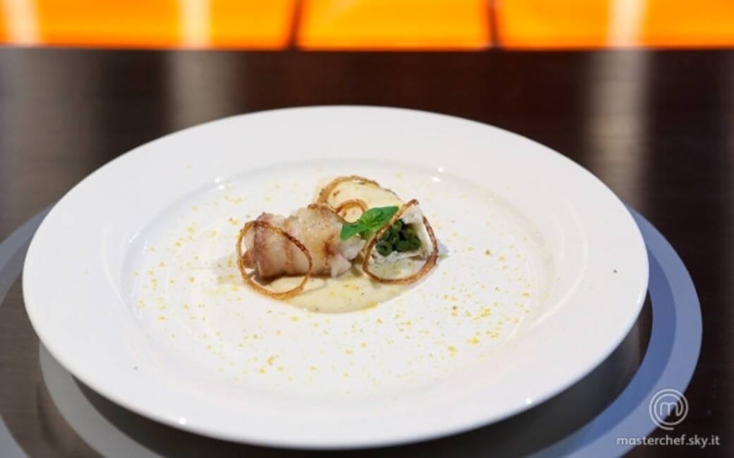 Sfilettare e spellare la rana pescatrice, disporre il filetto tra due fogli di pellicola trasparente e appiattirlo con un batticarne; nella parte interna inserire una foglia di salvia e metà del formaggio; bardare l'involtino con le fette di lardo e farlo rosolare in una padella molto calda per sigillarlo; finire la cottura in forno a 180°C, in modo da arrivare al cuore.