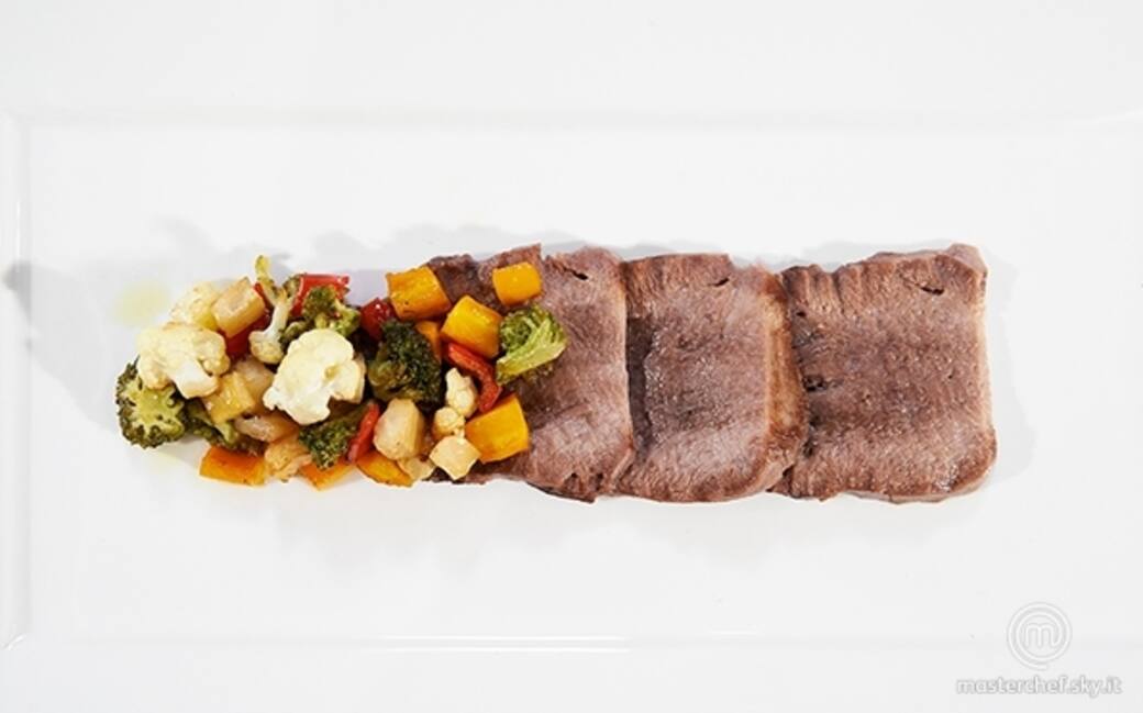 Mettere in una pentola a pressione la lingua di manzo con abbondante acqua, alloro e pepe in grani. Portare a ebollizione e lasciarla cuocere almeno 45 minuti dal fischio. Tagliare e pulire la cima di cavolfiore, la carota, il peperone, il broccolo ed il sedano rapa.