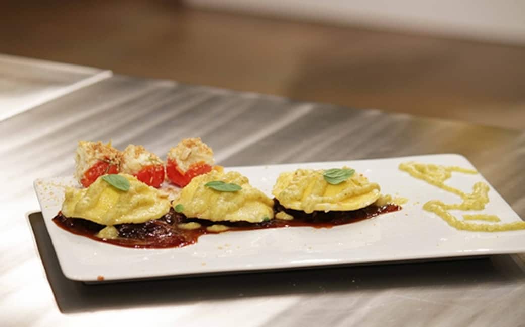 Cuocere, infine, i ravioli fino a quando vengono a galla e disporre sotto ogni raviolo un cucchiaio di salsa al mosto e sopra al raviolo uno di salsa ai tenerumi e finocchietto. Disporre al lato del raviolo un ciliegino farcito spolverato di pan grattato abbrustolito all’aglio. Ultimate lesinando gocce di essenza alimentare di mandorla dolce sui bordi interni del piatto.