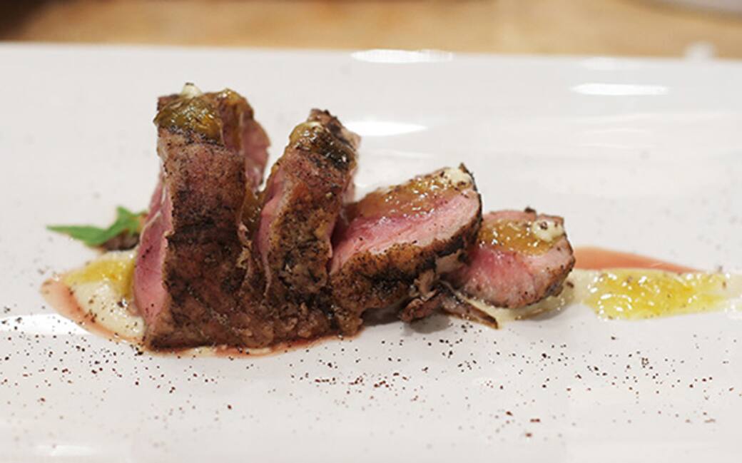 Salare e pepare la lonza. Passarla nel caffè in polvere per ottenere una sottile panatura. Alzare il fuoco della salsa e adagiarvi la lonza. Non appena si sarà rosolata da tutti i lati, sfumare con il mandarinetto.