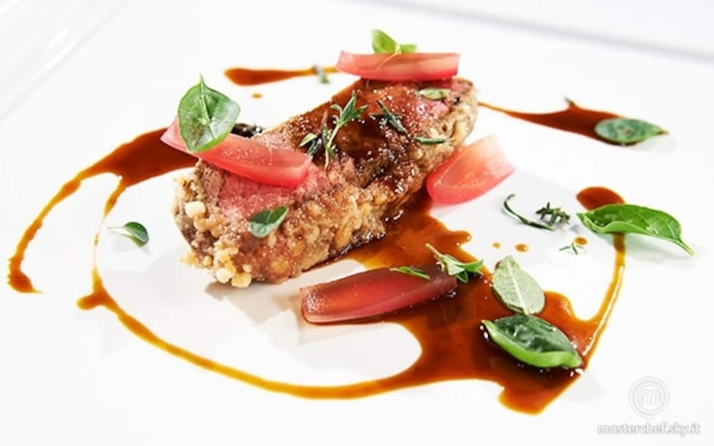 Passare la carne nelle noccioline tritate. Impiattare la carne e la cipolla guarnendo con le erbe aromatiche.