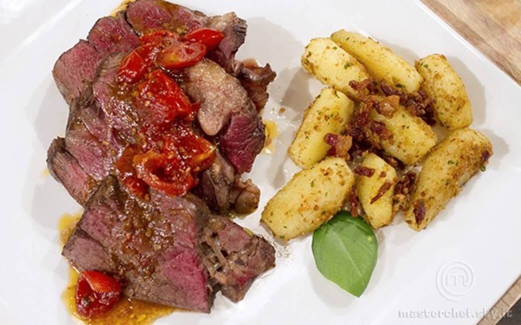 Infine tagliare il filetto e servirlo con i pomodorini.