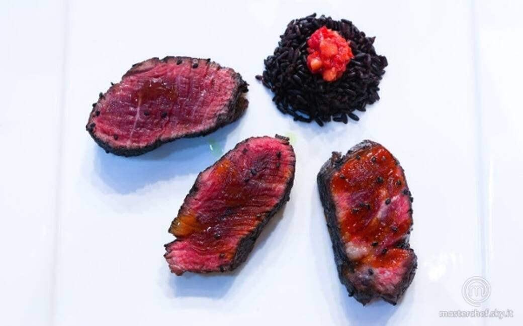 Impiattare mettendo il riso venere con sopra il preparato con peperoncino, fragola e lampone. Aggiungere il filetto a ventaglio con sopra la riduzione di peperone.