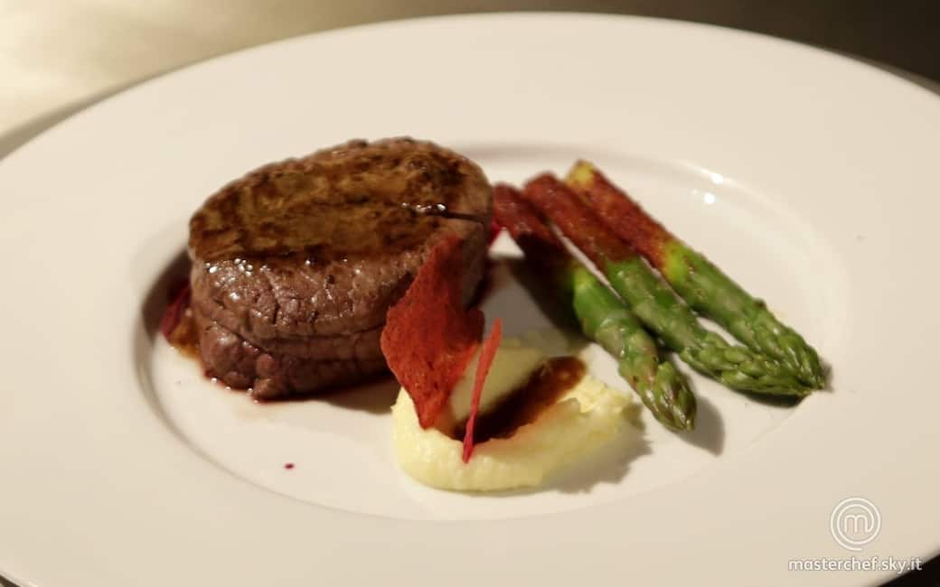 Mettere nel piatto due asparagi un po’ di riduzione di porto la carne con sopra della polvere di cumino tritata e il fondo di cottura aggiungere il purè affumicato e la cialda di barbabietola.