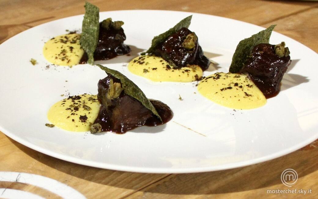 Tagliare il brasato a bocconcini e impiattare con la spuma di finta polenta. Cospargere di salsa la carne, aggiungere la polvere di caffè, qualche cappero fritto e la cialda di alga Nori. A parte disporre il sorpetto di cipolla rossa.