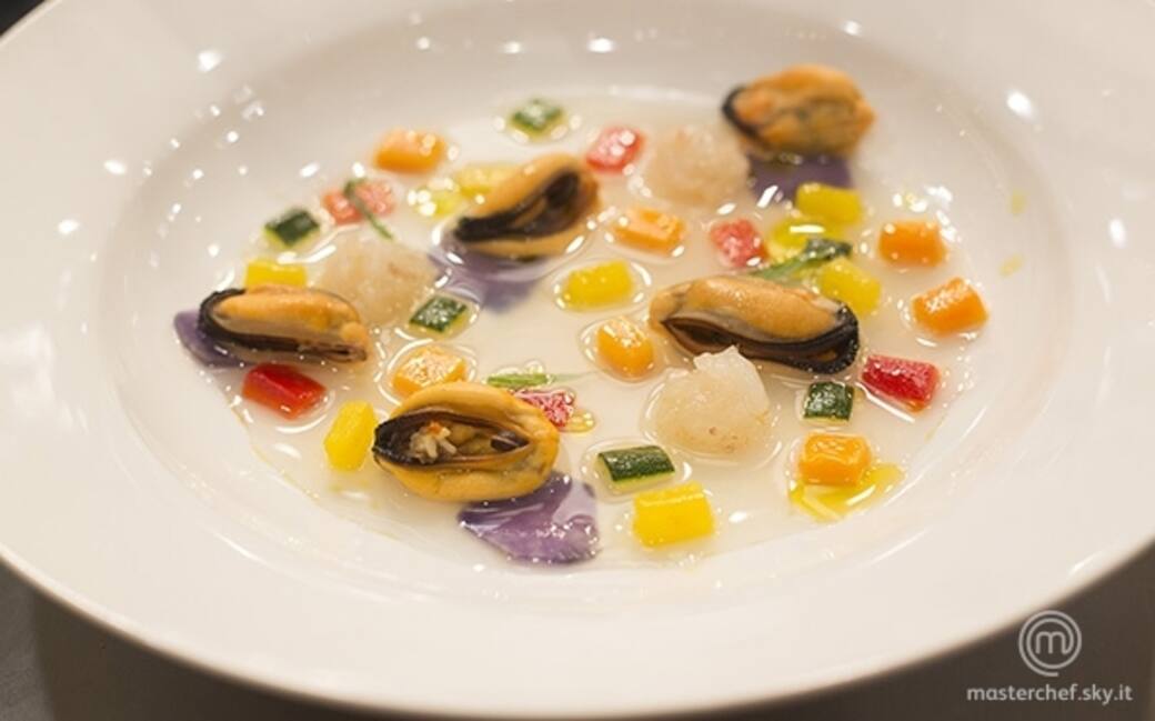Cuocere le patate in acqua bollente per circa 5-6 minuti. Cuocere tutte le altre verdure, separatamente, in una padella con un filo d'olio e un pizzico di sale.Filtrare l'acqua di mare utilizzando un colino foderato con un telo di cotone.
