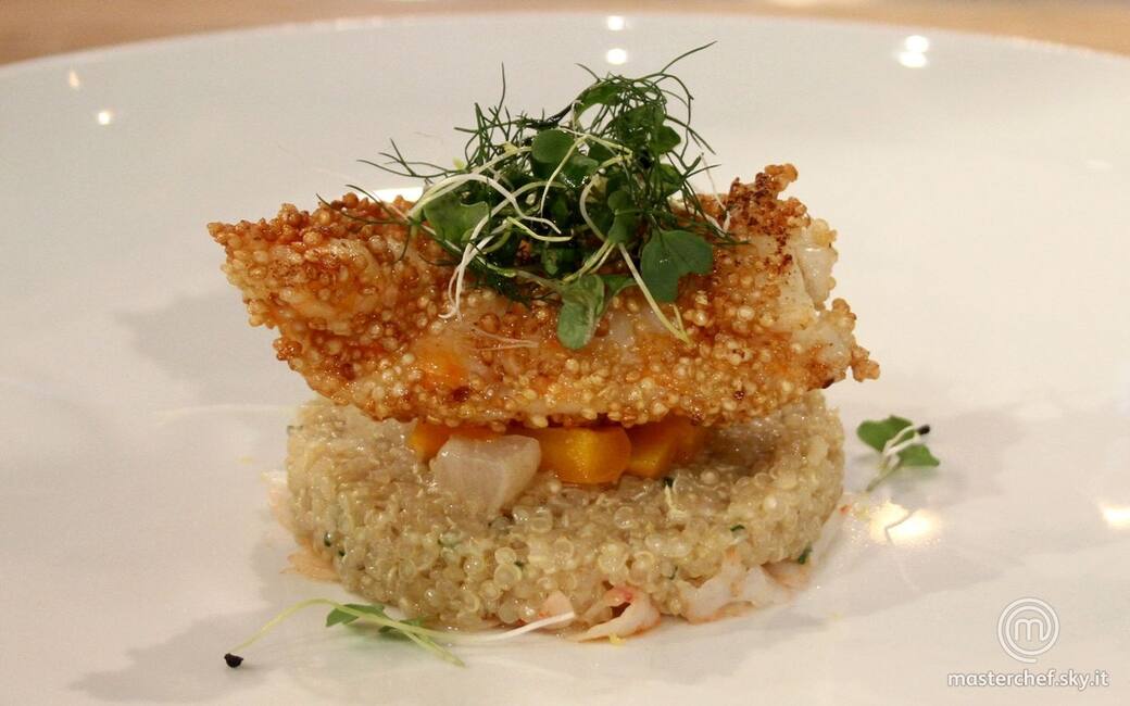 In un piatto piano mettere la battuta di gambero con sopra la quinoa e le verdure. Mettere sopra il gambero fritto e l’insalatina. Usare i germogli di crescione per decorare.