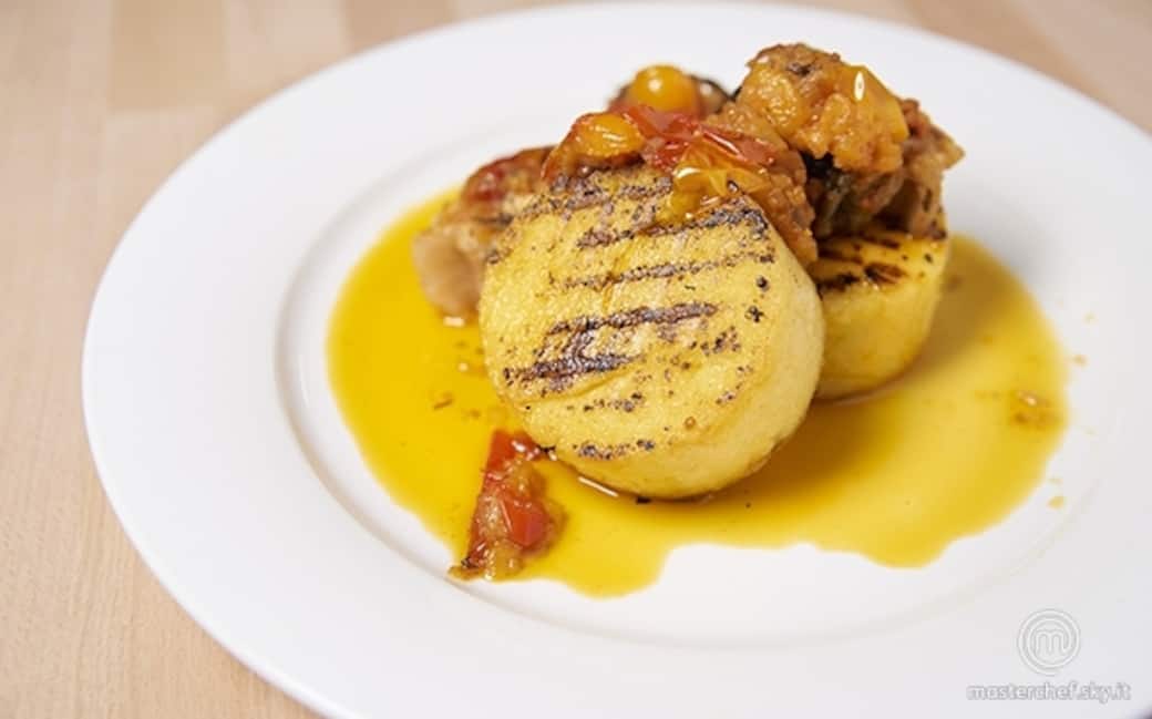 In un patto circolare porre i due medaglioni di polenta. Versare su ognuno, con un cucchiaio, il sugo di pomodoro. In cima ad ognuno un pezzo di anguilla cotta. Infine versare il sugo di pomodoro rimanente alla base dei medaglioni e aggiungere il terzo pezzo di anguilla.