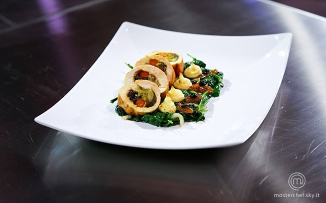 Tagliare i petti di pollo a ventaglio, batterli con un batticarne fino a che risulta una bella fetta. Farcirli con le carote, i datteri, le prugne, un po' di cipolla al miele e le olive verdi, arrotolare bene il pollo e sigillarlo bene. Ungerlo di olio e speziarlo con paprika e sale. Rosolare molto dolcemente in padella per almeno 20 minuti. Avvolgerlo nella carta di alluminio formando un salsicciotto e lasciarlo riposare 4 minuti.