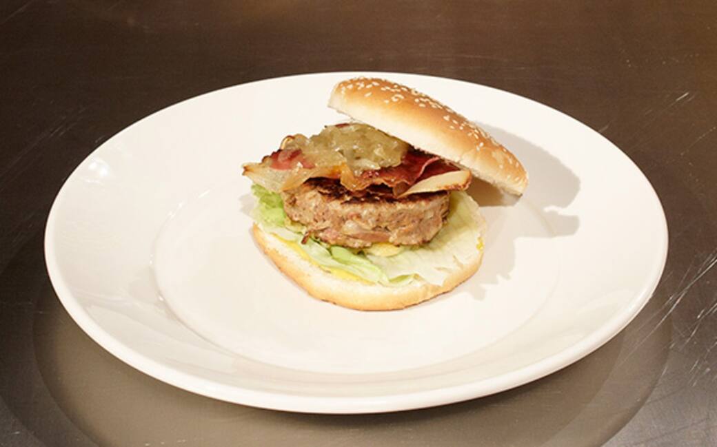 Aprire a metà i panini, spalmare un cucchiaio di maionese su entrambe le metà, adagiare una foglia di insalata, il Casolet, poi l'hamburger, qualche filo di cipolle caramellate e quindi lo speck croccante, chiudere.