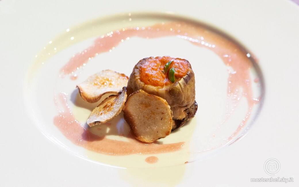 Melanzana ripiena, chips di patata dolce caramellate e riduzione di melagrana e mela