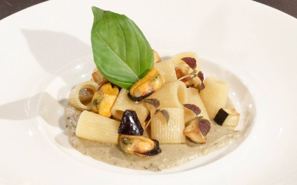 Tagliare le melanzane a cubi, infarinarne una metà e friggerla. Rosolare la metà restante finchè non si ammorbidiscono e frullarle con l’acqua di cottura delle cozze.