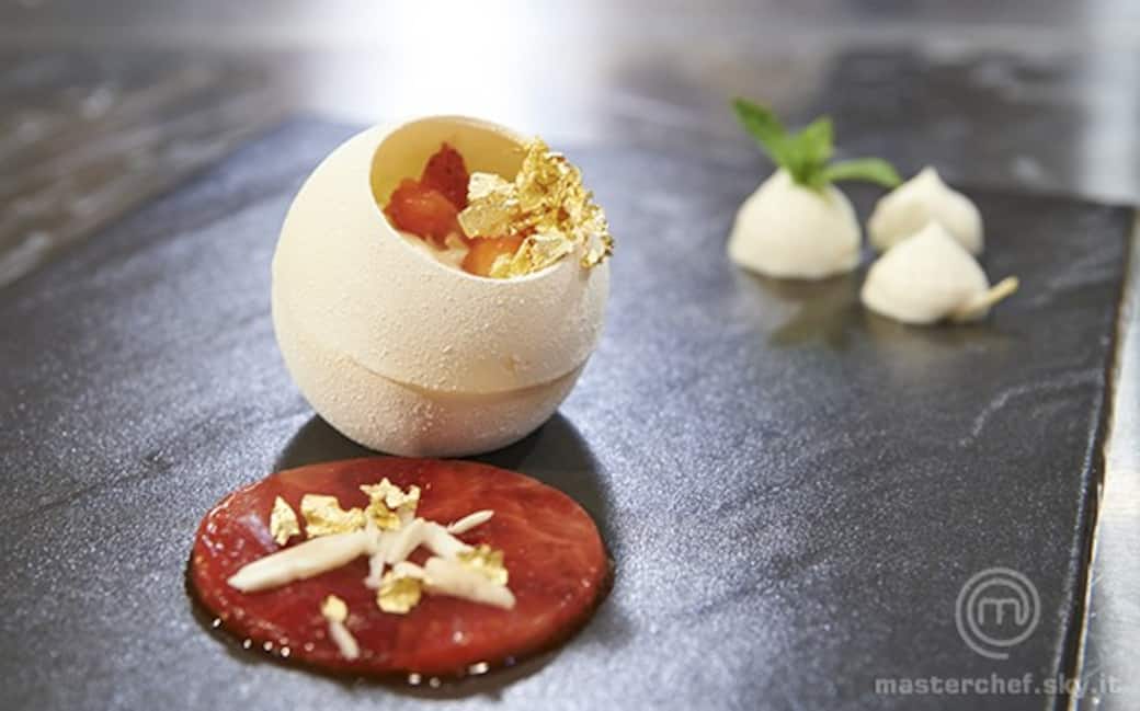 Impiattare: aprire il sacchetto contenente il carpaccio di fragole, coppare un cerchio e adagiarlo nel piatto. In superficie mettere un po’ di limone. Porre poi un guscio di cioccolato bianco come base, dressare sulla base la crema di yogurt, qualche mandorla tagliata al coltello e le fragole rimaste tagliate a brunoise. Chiudere il dolce con un’altra semisfera di cioccolato bucata. Prendere un’altra sac a poche e dressare dei ciuffetti di crema di yogurt a lato, sui ciuffetti porre la menta e un dell’oro dentro al guscio. Terminare con delle mandorle e dell’oro sul carpaccio di fragole.