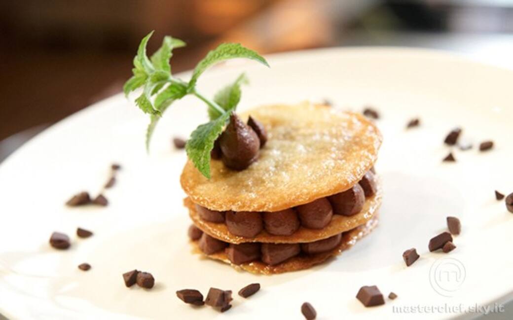 Comporre il piatto alternando le cialde con la crema e guarnire con i pezzi di cioccolato e le foglie di menta.