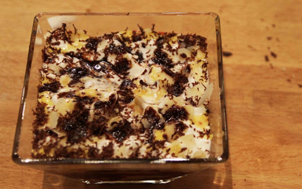 Guarnire con panna montata, scaglie di cioccolato e mandorle tostate. Servire.