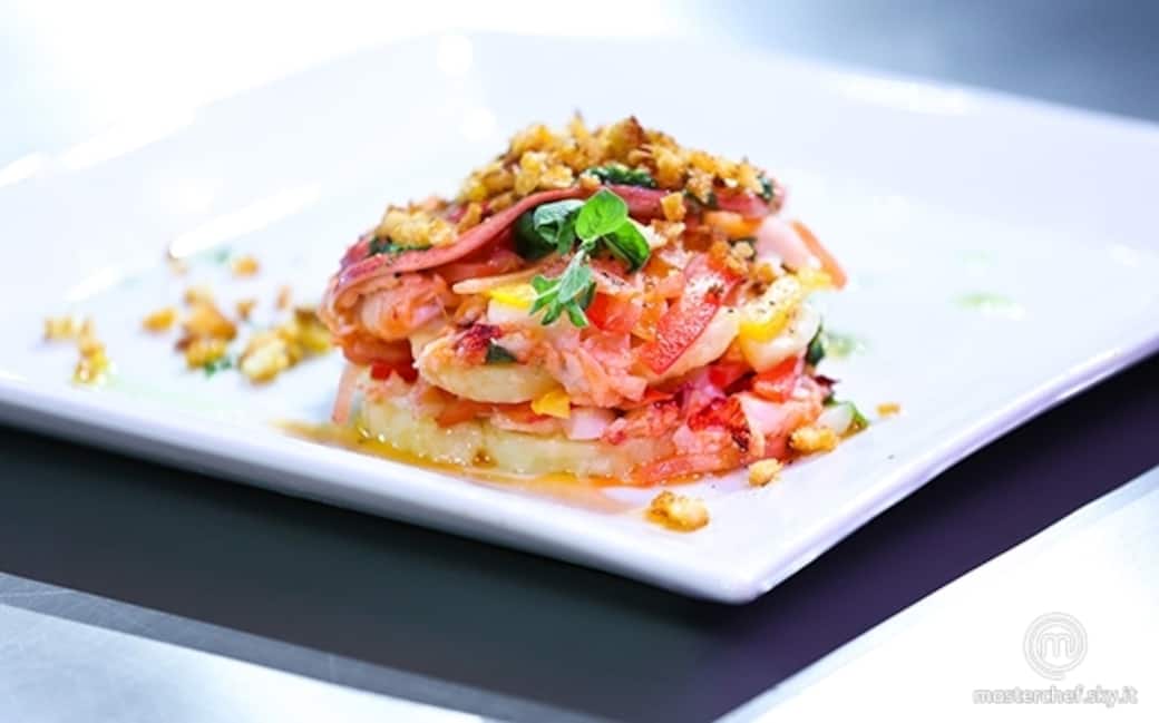 Lessare le patate ben lavate ma non sbucciate. A cottura completata, scolare le patate, raffreddarle velocemente, pelarle e tagliarle a medaglioni dello spessore di circa 5 millimetri. Ricavare una falda dal peperone giallo ed una dal peperone rosso, tagliare a julienne e mettere in una ciotola con acqua e ghiaccio; tagliare a julienne anche i pomodori e metterli in un'altra ciotola.