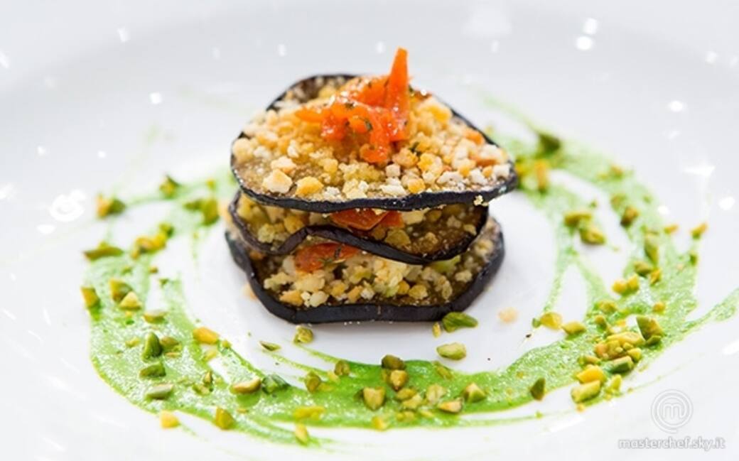 Impiattare creando una millefoglie alternando le fette di melanzane, il ragù di pesce e il sughetto di pomodorino fresco. Decorare con del pesto di sedano e con i pistacchi tritati grossolanamente.