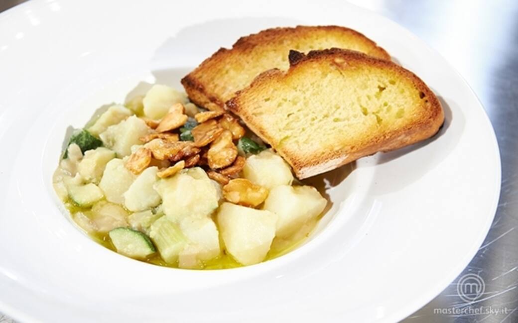 In un tegame mettere a soffriggere olio e cipolla, unire le verdure con acqua necessaria per la cottura e lasciar cuocere per circa 20 minuti. Far bruschettare il pane in forno con la funzione grill, bagnandolo con qualche goccia di olio.