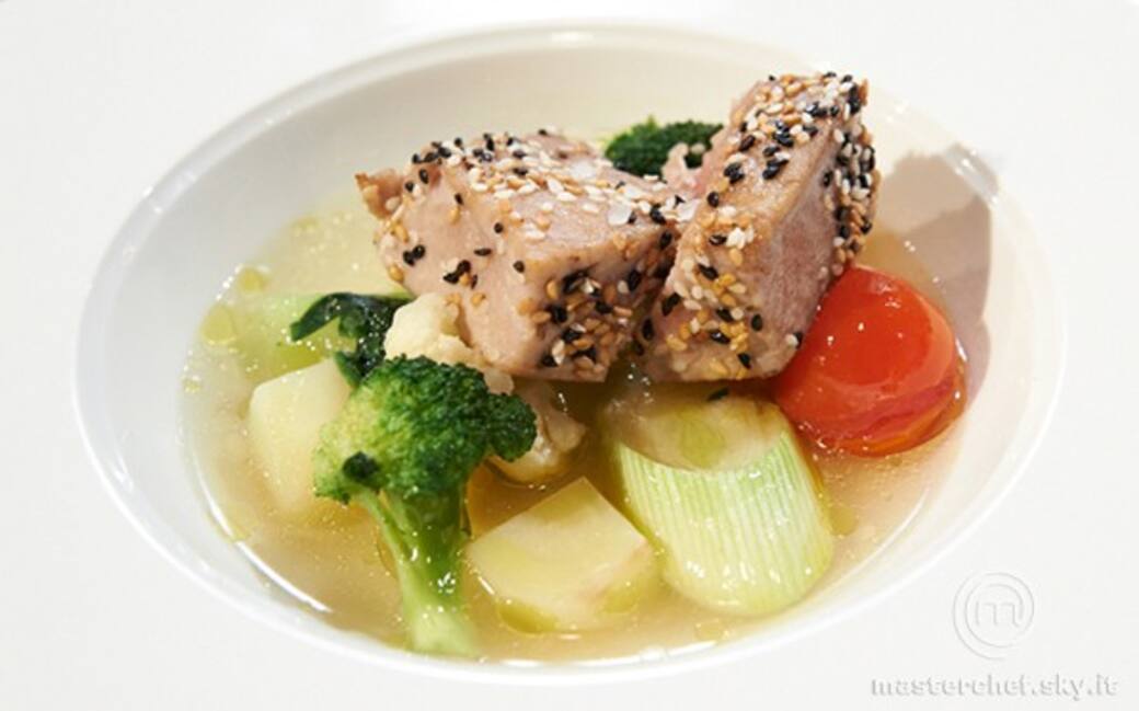 Tagliare a cubi il tonno, rosolarlo in padella con olio, un po’ di scalogno per aromatizzarlo. Passarlo nel sesamo bianco e nero e infornare a 200° per 2 minuti.