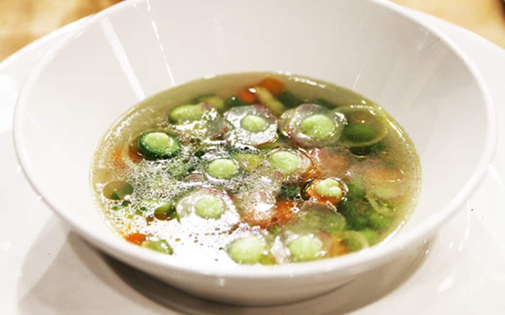 Servire il minestrone aggiungendogli le fettine di rapanello, le cipolle arrosto e qualche goccia di crema di fagioli.