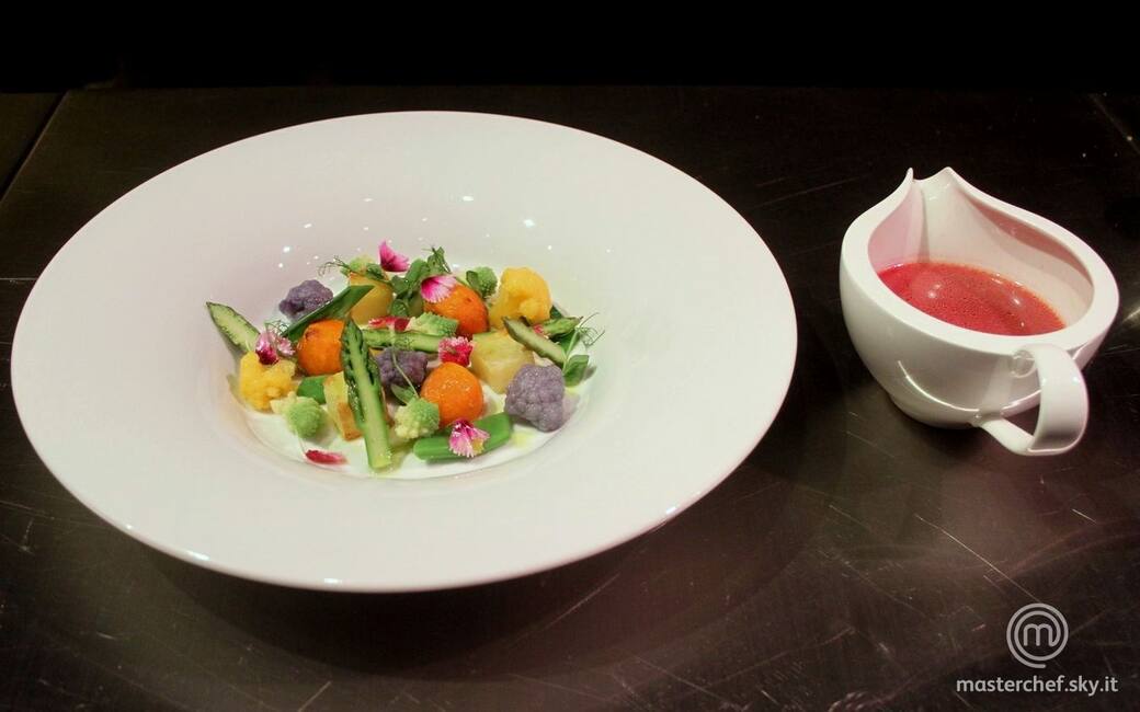In acqua bollente salata sbianchire le verdure tagliate una alla volta partendo da quelle che rilasciano meno colore e sapore, quindi in ordine: taccole, piselli, Broccolo, cavolo giallo, cavolo viola. Passarle poi subito in acqua e ghiaccio per mantenere il colore e asciugare.