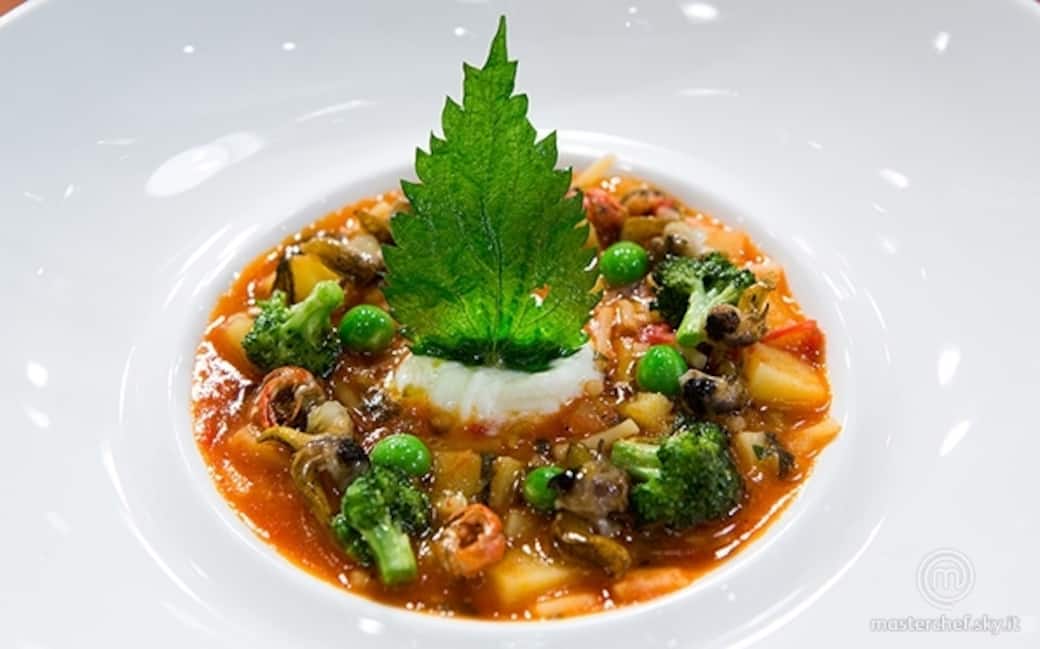 Impiattare in una fondina creando una serie di cerchi con piselli, lumachine e broccoli. Adagiare nel centro la pallina di burrata con la foglia di ortica e concludere con una spolverata pepe nero per ultimare il piatto.