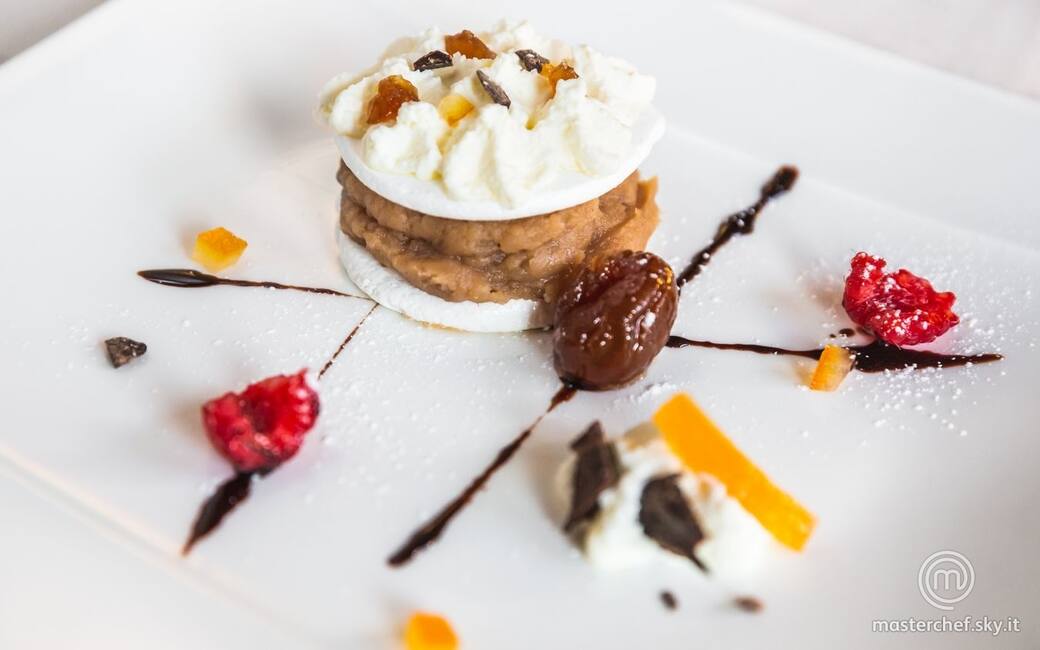 Comporre il piatto disponendo poca crema al centro del piatto da portata, coprire con un primo disco di meringa quindi ancora uno strato di crema e un altro disco. Infine fare degli spuntoni di panna montata e decorare con un marron glacé.