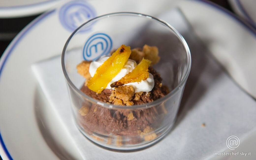 Comporre il dessert in un bicchiere: posizionare un po’ di crumble, aggiungere la mousse, un altro strato di crumble, una quenelle di crema di cocco e l’ananas caramellato.