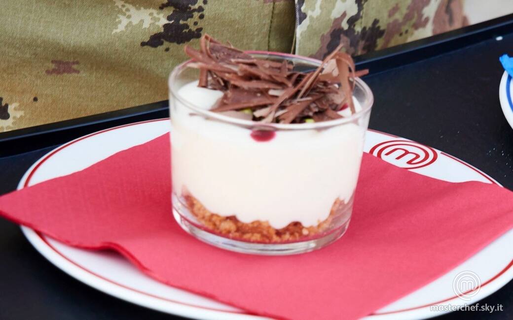 Impiattare disponendo alla base di una ciotola il crumble, poi la crema al mascarpone e poi i frutti di bosco. Completare con la granella di pistacchi e il cioccolato fondente a scaglie.