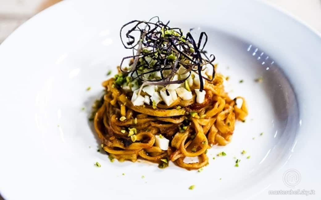 Friggere la buccia di melanzana tagliata a listarelle sottili e impiattare un nido di pasta con al centro un cubo di mozzarella. Adagiarvi sopra una dadolata di mozzarella e la buccia di melanzana fritta. Un giro d’olio per terminare il piatto.