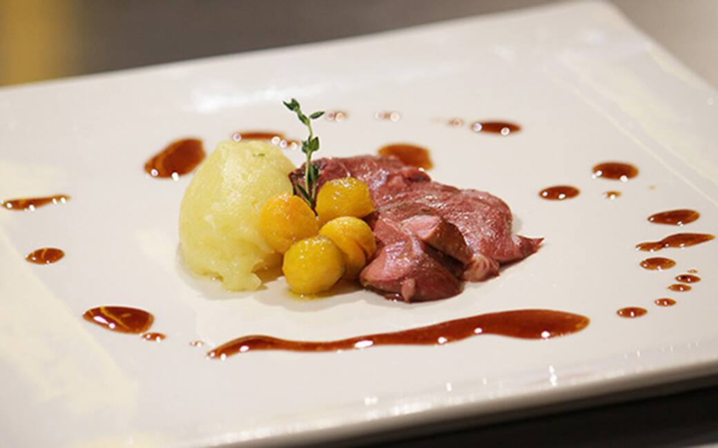 Servire una quenelle di purea di patate affumicare con alcune fette di petto, le palline di zucca e la salsa ricavata addensando i filtrando il fondo di cottura.