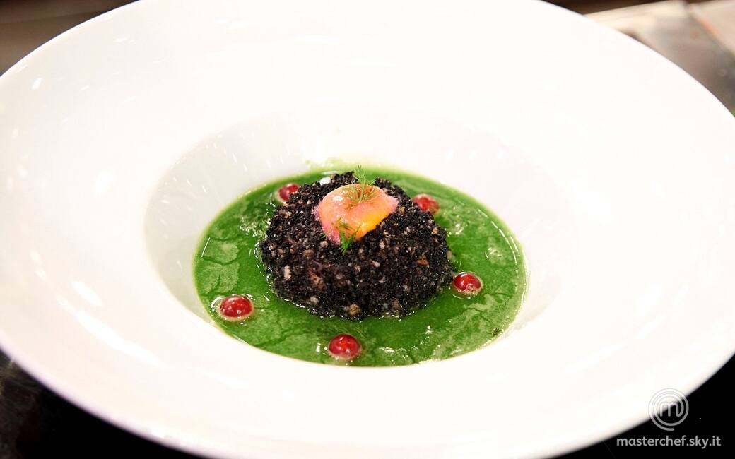 Comporre l’arancino con la tartare di gamberi, inserire all’interno un cuore di caviale, passare nella panatura nera e posizionare al centro di una fondina. Aggiungere il gazpacho, posizionare il tuorlo, qualche goccia di marinatura, qualche ribes e qualche fogliolina di finocchietto.