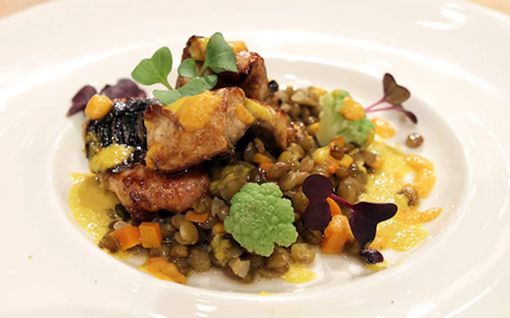 Disporre in una fondina un po’ di lenticchia ripassata e sopra alcuni pezzetti di capitone all’aceto balsamico. Condire e decorare con le due salse, gli alberelli di cavolfiore verde e i germogli misti. Aggiustare di sale e olio.