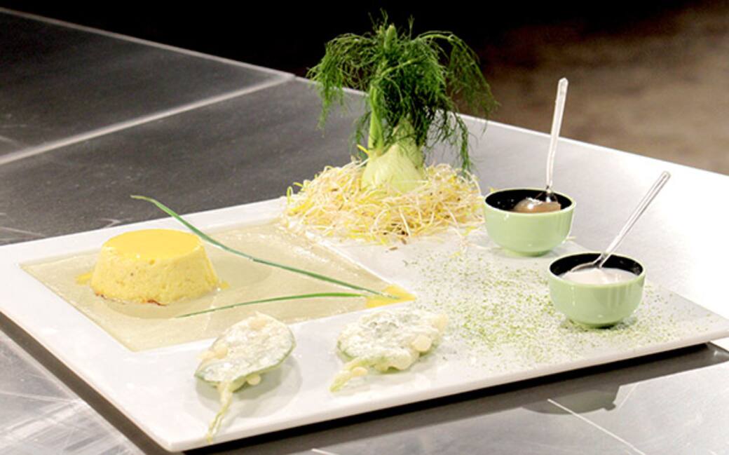 Per lo zabaione: Versare due tuorli d'uovo, 70 grammi di parmigiano, un pizzico di noce moscata e il fondo della crema di finocchi in un bagnomaria e portare a cottura con l'aiuto di una frusta fino a raggiungere l'effetto cremoso desiderato.