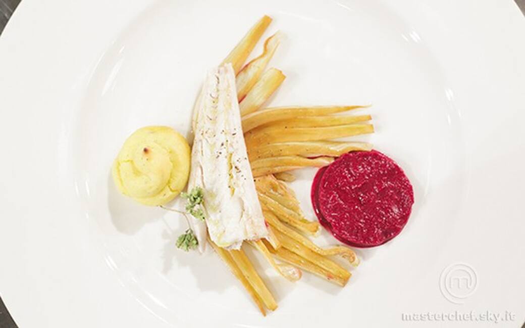 Pulire il pesce, ricavarne un filetto e servirlo su un ventaglio di finocchi con la crema di barbabietola e il purè al forno.