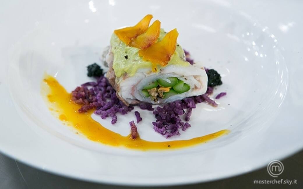 Comporre il piatto schiacciando le patate viola sul fondo, adagiandovi sopra l'involtino di ombrina privato dello spago. Su ogni involtino spalmare un po’ di crema di avocado e decorare con tre fettine di bottarga. Aggiungere intorno la crema di asparagi e nero di seppia.