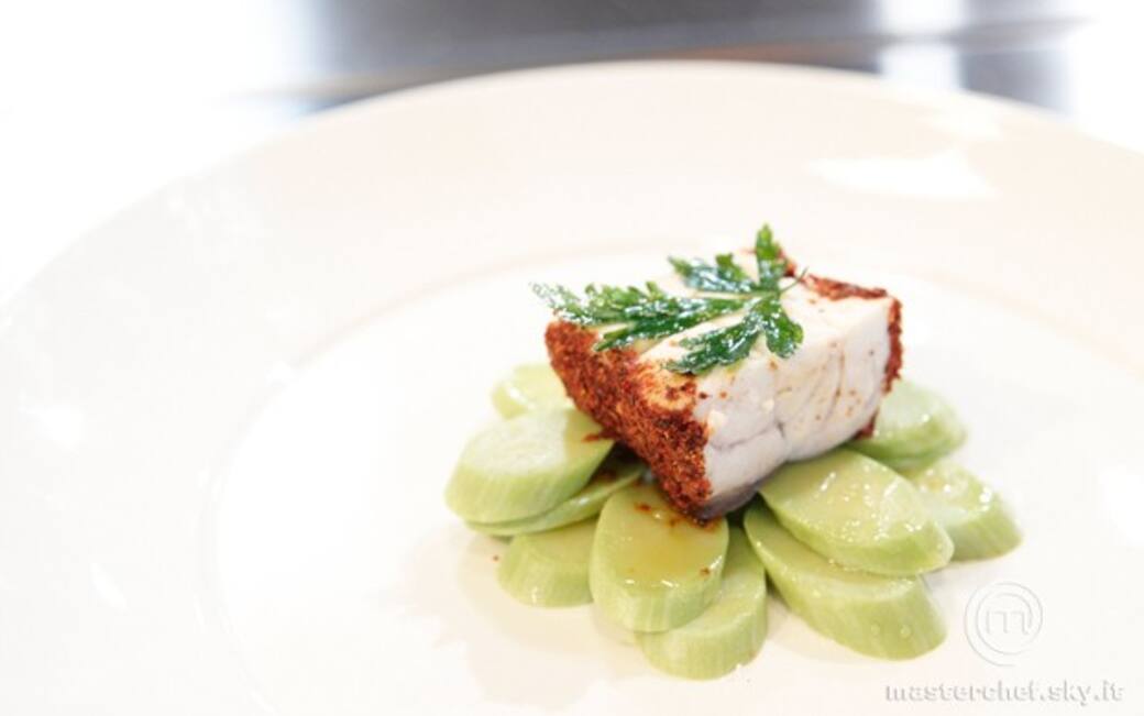 Impiattare: con un coppa pasta disporre le rondelle di zucchine a raggiera, spennellarle con poco olio, aggiungere una presa di sale. Adagiarvi sopra il pesce e sopra decorare con la foglia fritta. Servire.