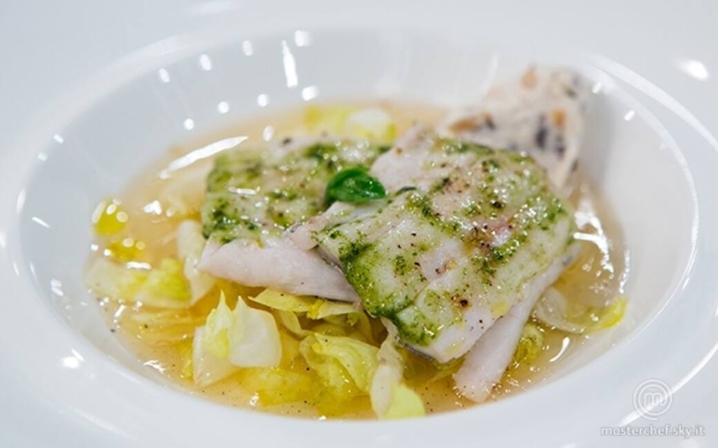 In una fondina, versare l'acqua di pomodoro precedentemente filtrata dal basilico, aggiungere al centro del piatto una cucchiaiata di scarola saltata, e su di essa adagiare due tranci di pesce spatola posati in bell'ordine, condire l'acqua di pomodoro con qualche goccia di olio evo e una leggera macinata di pepe bianco e terminate condendo i tranci di pesce spatola con l'emulsione di basilico e olive nere. Servire tiepido.