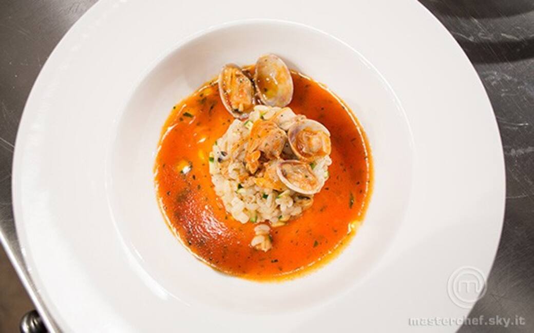 Tagliare i pomodorini e cuocerli in padella con olio, sale, l’aglio in camicia. Passarli al setaccio e aggiungere l’acqua di mare delle vongole filtrata. Far restringere il guazzetto.