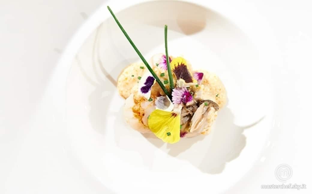 Ostrica poché al prosecco, capesante alla plancia e crema bianca di Granseola