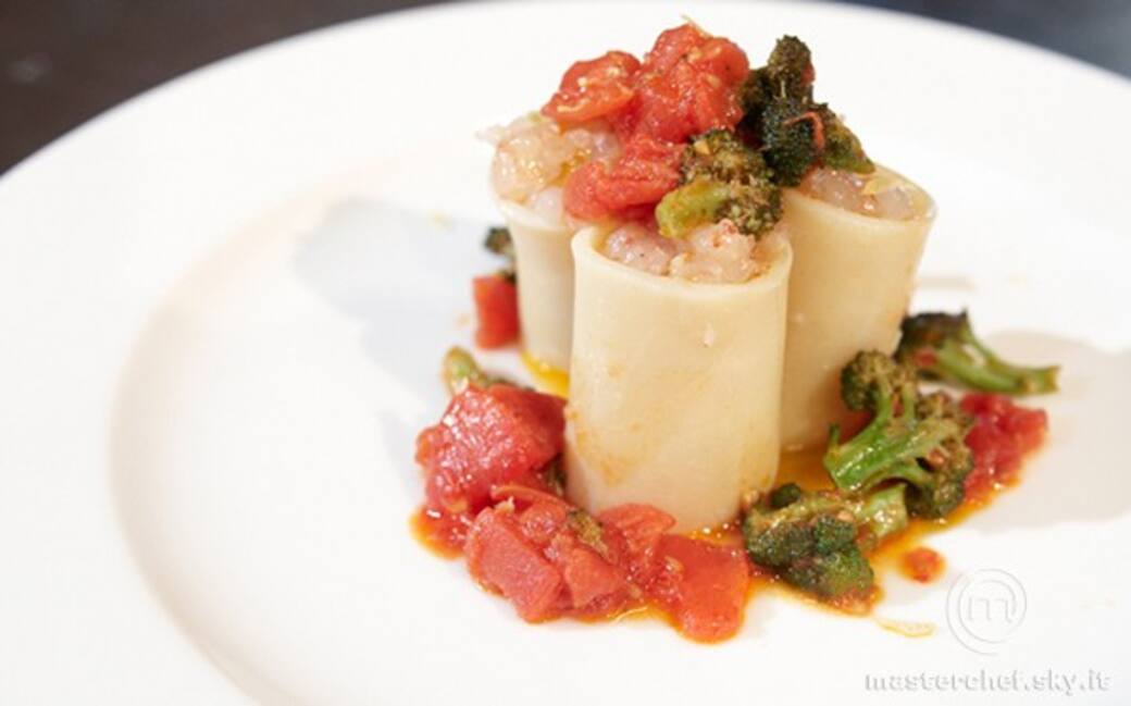 Tagliare i pomodori a cubi precedentemente sbollentati e spellati. Aggiungerli ai broccoletti. Eliminare l’aglio e aggiungere ½ cucchiaio di colatura d’alici. Scolare i paccheri dall’acqua e farcirli con la tartare di gamberi.