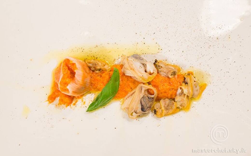 Con una sac à poche riempire i paccheri con la pappa al pomodoro, sistemare a piacere i frutti di mare nel piatto con altra pappa, regolare di sale, pepe, olio e guarnire con foglie di basilico.